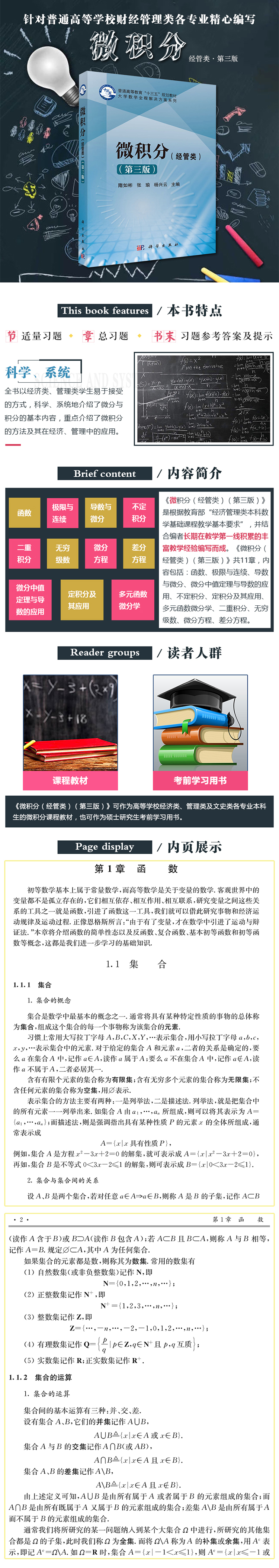内容简介本书是根据教育部“经济管理类本科数学基础课程教学基本要求”,并结合编者长期在教学第一线积累的丰富教学经验编写而成.全书共11章,内容包括:函数、极限与连续、导数与微分、微分中值定理与导数的应用、不定积分、定积分及其应用、多元函数微分学、二重积分、无穷级数、微分方程、差分方程.本书按节配置适量习题,每章配有总习题,书末附有习题参考答案及提示,便于读者参考.全书以经济类、管理类学生易于接受的方式,科学、系统地介绍了微分与积分的基本内容,重点介绍了微积分的方法及其在经济、管理中的应用.